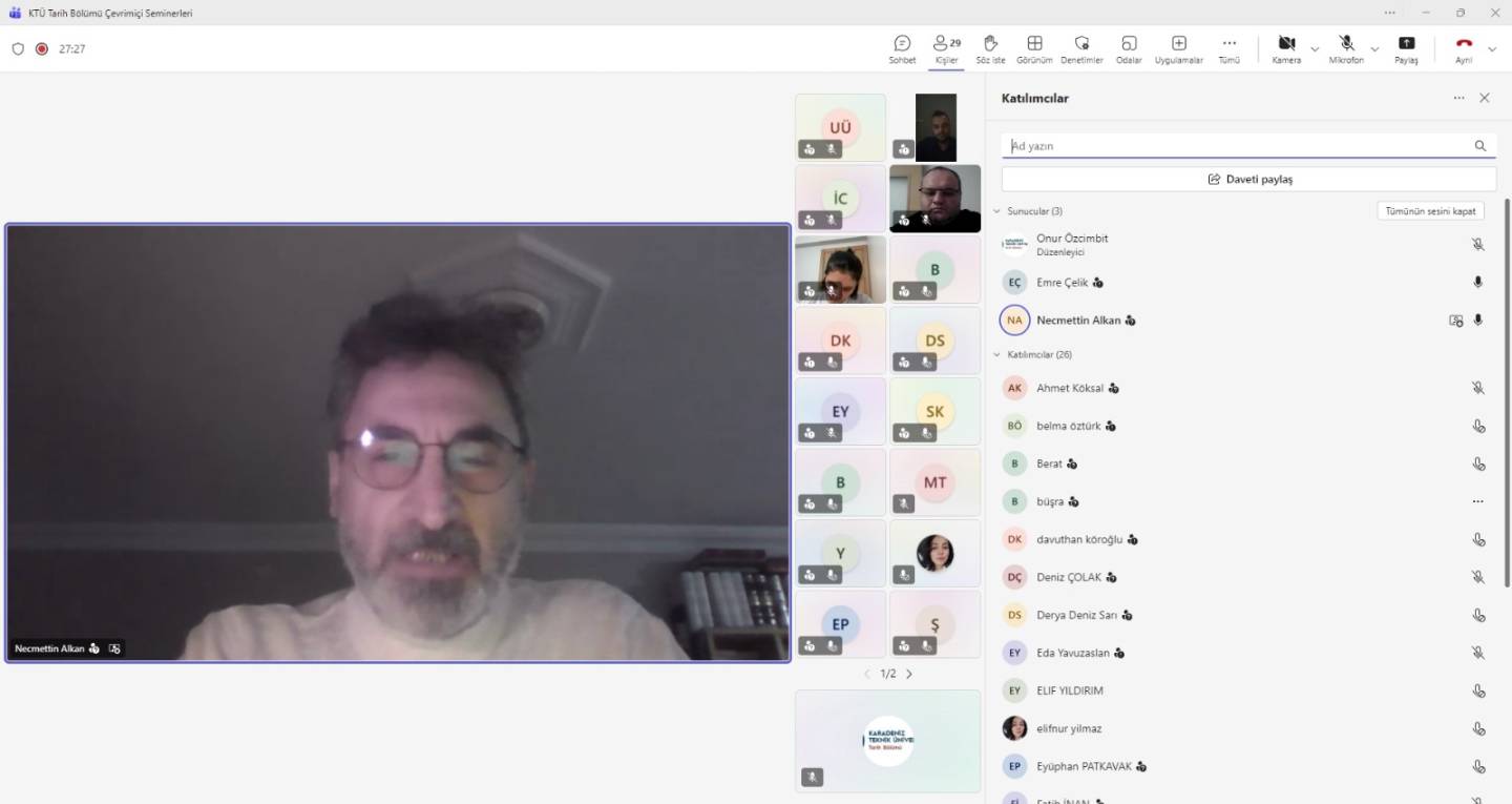 24.12.2025 tarihinde saat 20:00'da Sakarya Üniversitesi hocalarından Prof. Dr. Necmettin Alkan'ın sunumu ile Sultan 2. Abdülhamid Algısı Üzerine Tezler ve Tartışmalar adlı çevrimiçi seminer KTÜ tarih bölümü hocaları ve öğrencilerinin de katılımı ile gerçekleştirilmiştir.
