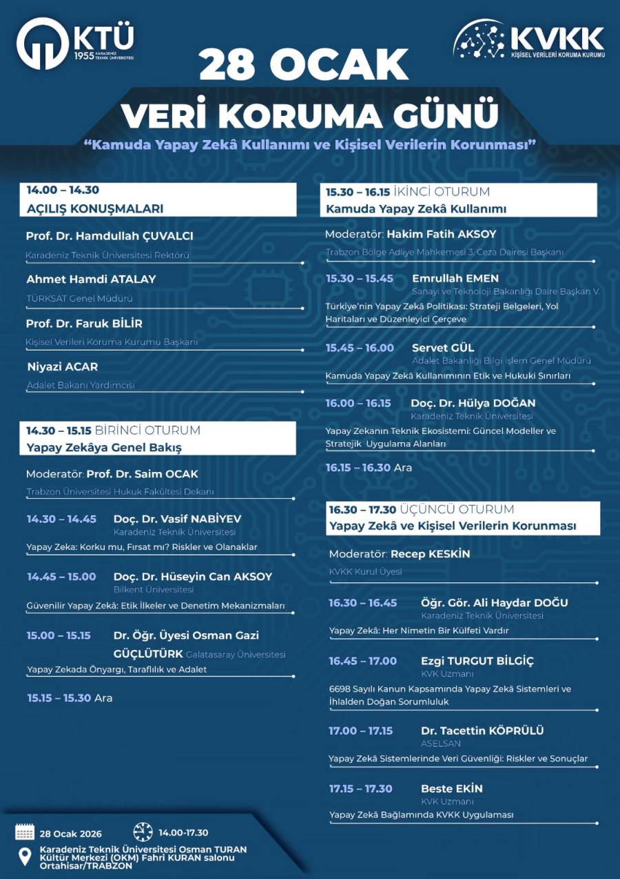 Veri Koruma Günü, bu yıl 28 Ocak 2026 tarihinde, Karadeniz Teknik Üniversitesi Prof. Dr. Osman Turan Kültür ve Kongre Merkezi’nde gerçekleştirilecek olan “108 Sayılı Sözleşme’nin 45. Yılında Kamuda Yapay Zekâ Kullanımı ve Kişisel Verilerin Korunması” Paneli ile kutlanacaktır.
