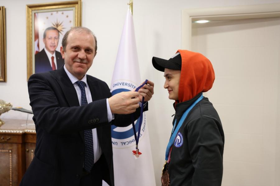 Rektörümüzün, sporcumuza altın madalya takdim ederek kendisine burs desteği sağlayacaklarını ifade etmesinin ardından Fatma KELEŞ çok mutlu olduğunu, bu durumun şampiyonluk yolunda motivasyonunu arttırdığını ve olimpiyat yolunda önemli bir şampiyonluk kazandığını dile getirerek desteklerinden dolayı Rektörümüz Prof. Dr. Hamdullah ÇUVALCI’ya teşekkürlerini sundu.