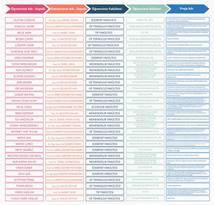TÜBİTAK 2209-A Üniversite Öğrencileri Araştırma Projeleri Destekleme Programı kapsamında, Üniversitemizde öğrenim gören 45 adet lisans öğrencisi, proje başvurusunda bulunmuş olup Tarih, Yazılım Mühendisliği, Tıp, Sosyoloji, Metalurji ve Malzeme Mühendisliği, Elektrik-Elektronik Mühendisliği, İngiliz Dili ve Edebiyatı, Eczacılık alanlarında öğrenim gören 30 lisans öğrencisi, bu program kapsamında desteklenmeye hak kazanmıştır.