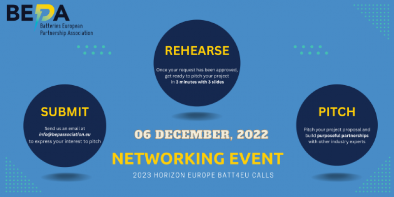 BEPA Ağı, 28 Kasım 2022 tarihinde resmi olarak yayımlanması beklenen Ufuk Avrupa (Horizon Europe) Programı, “Küme 5: İklim, Enerji Mobilite 2023-2024 Çalışma Programı” altında açılacak batarya alanıBatt4EU 2023 çağrıları için 6 Aralık 2022 tarihinde, Brüksel’de, konsorsiyum oluşturma faaliyetlerine destek olacak bir Proje Pazarı (ağ kurma) etkinliği gerçekleştirilecektir. Etkinlik Ufuk Avrupa çağrıları için konsorsiyumlarda yer almak isteyen batarya endüstrisindeki tüm paydaşlara, akademisyenlere, politika yapıcılara ve araştırmacılara hitap etmektedir.