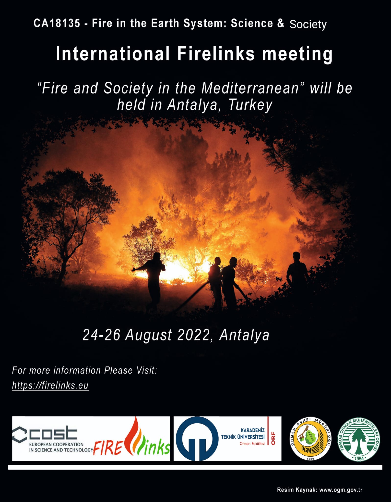Türkiye'yi temsilen Üniversitemiz Orman Fakültesi Öğretim Üyesi Doç. Dr. Turgay DİNDAROĞLU’nun MC (Yönetim Kurulu) Üyesi olarak yer aldığı; CA18135 kodlu “Fire in the Earth System: Science & Society” aksiyon kapsamında “Firelinks meeting-Fire and Society in the Mediterranean” başlıklı çalışma ve ekskürsiyon programı, 24-26 Ağustos 2022 tarihleri arasında Üniversitemiz Orman Fakültesi ve Antalya Orman Bölge Müdürlüğü iş birliği ile Antalya’da düzenlenecektir.