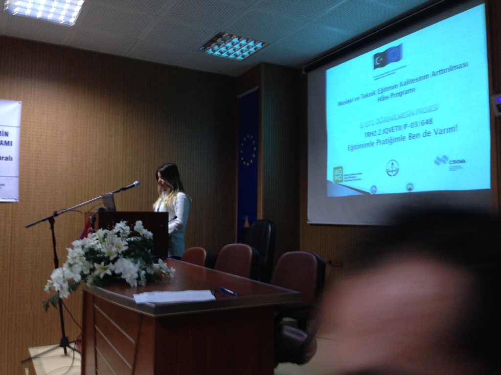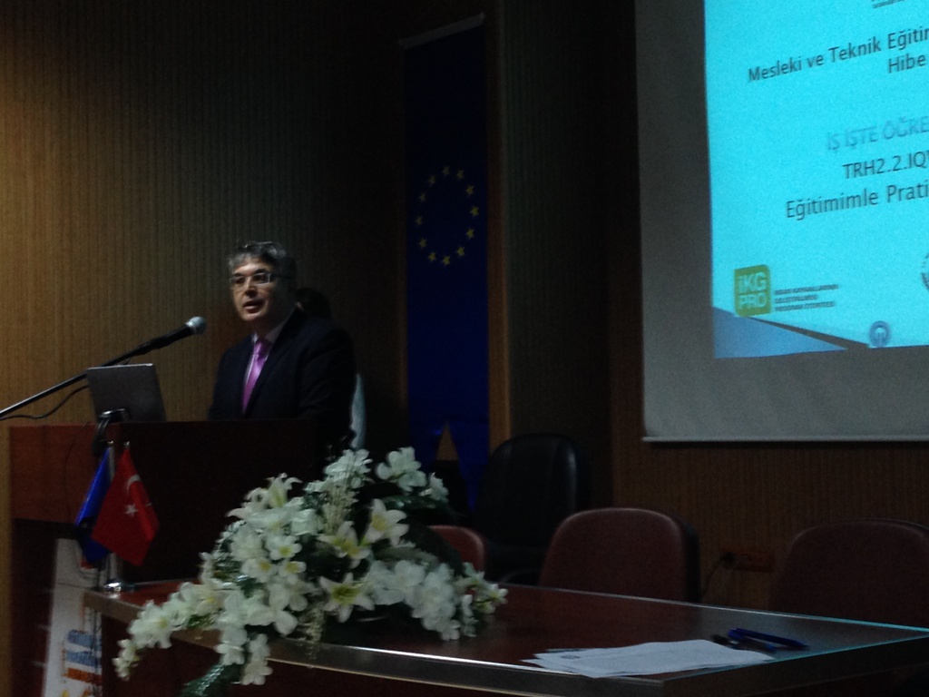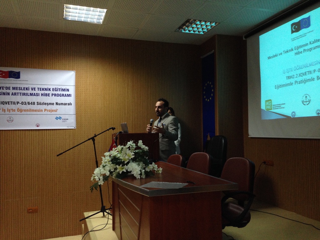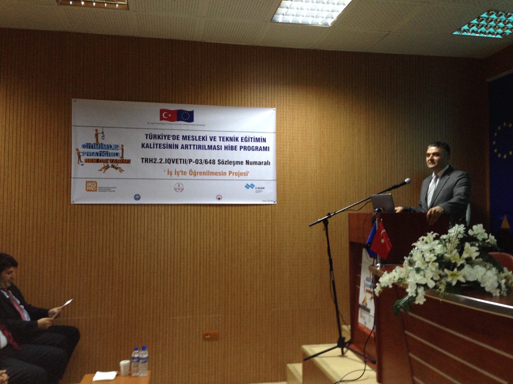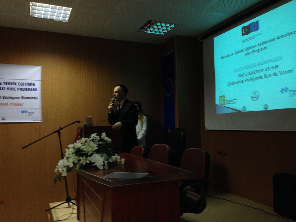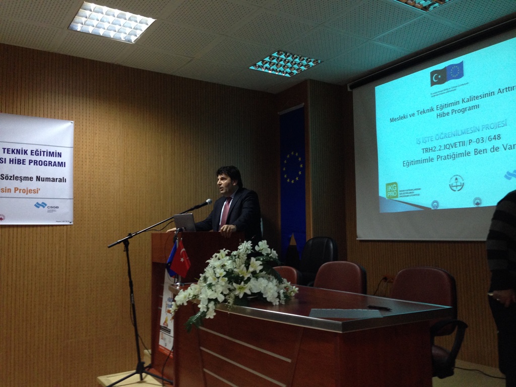 Çalışma ve Sosyal Güvenlik Bakanlığı–Avrupa Birliği Koordinasyon Dairesi Başkanlığı tarafından desteklenen “Türkiye’de Mesleki ve Teknik Eğitimin Kalitesinin Arttırılması Hibe Programı”kapsamında Karadeniz Teknik Üniversitesi Teknoloji Transfer Ofisi’nin yürüttüğü TRH2.2.IQVETII/P-03/648 referans numaralı “İş İş’te Öğrenilmesin” projesinin tanıtım toplantısı; Proje yürütücüsü Prof.Dr. Cüneyt ŞEN, Trabzon Meslek Yüksek Okulu Müdürü Prof.Dr. Mustafa K. DEĞER, Trabzon Ticaret ve Sanayi Odası Yönetim Kurulu Üyesi Şaban BÜLBÜL, Akçaabat Belediye Başkanı Şefik TÜRKMEN, Akçaabat İlçe Kaymakamı Soner ŞENEL, Proje Koordinatörü Yrd.Doç.Dr. Oktay YILDIZ, KTÜ Teknoloji Transfer Ofisi Başkanı Prof.Dr. Ali Osman BELDÜZ, değerli akademisyenlerimiz ve öğrencilerimizin katılımıyla 04.12.2014 perşembe günü saat 14:00'da Karadeniz Teknik Üniversitesi Trabzon Meslek Yüksek Okulu Toplantı Salonunda yapılmıştır.