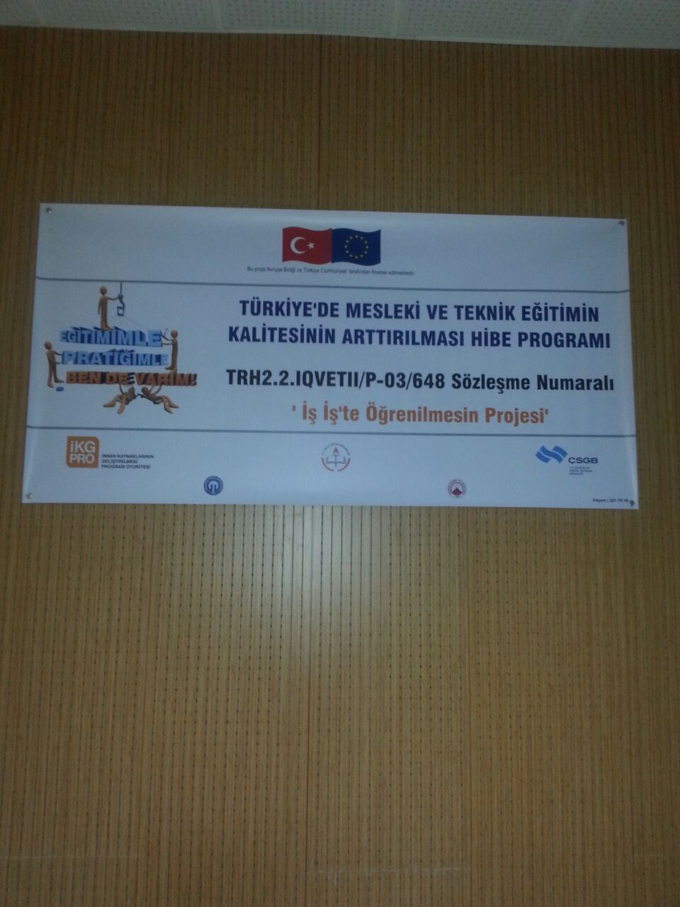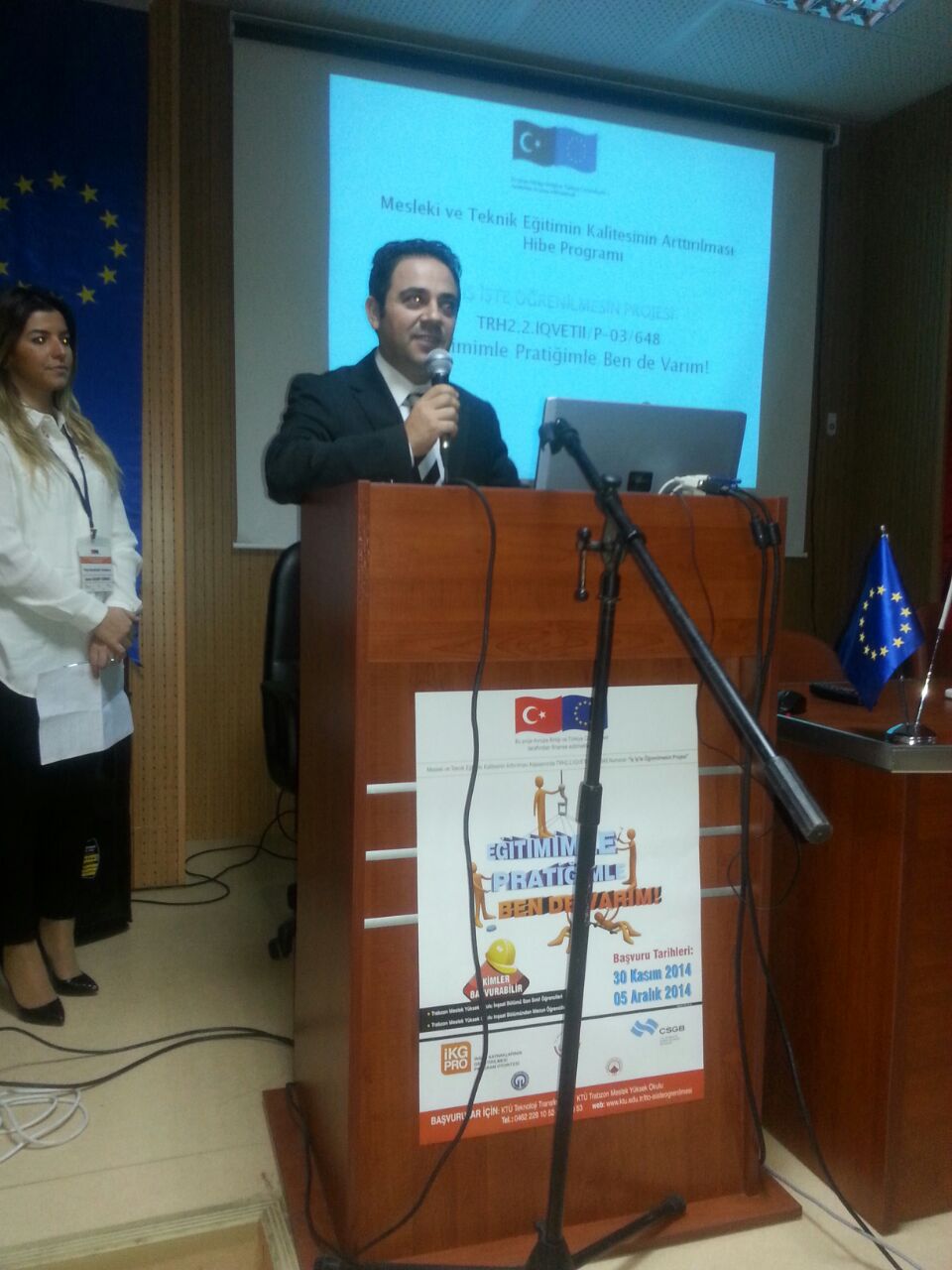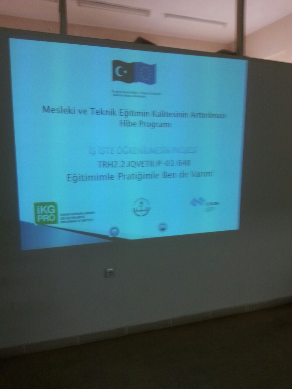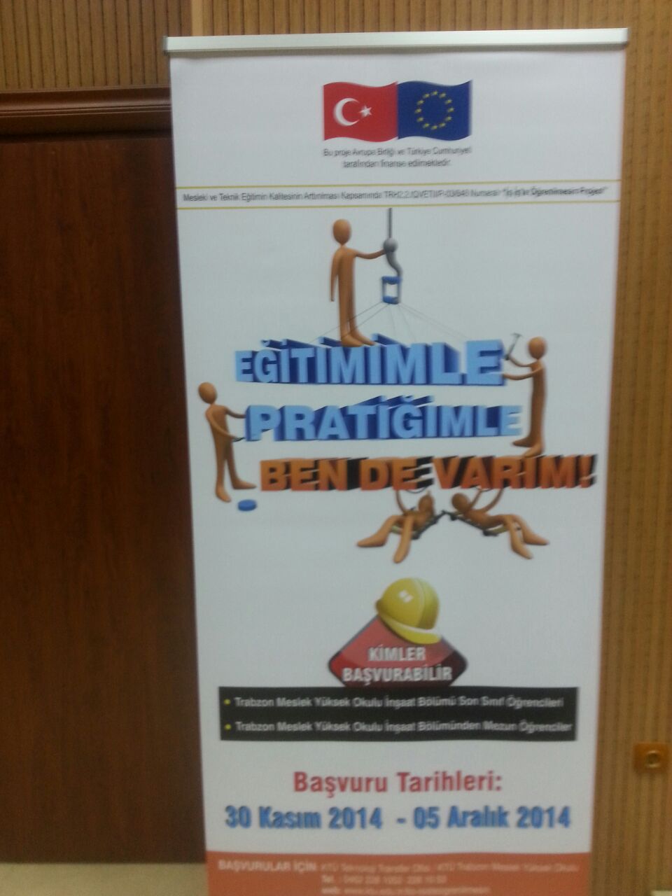 Çalışma ve Sosyal Güvenlik Bakanlığı–Avrupa Birliği Koordinasyon Dairesi Başkanlığı tarafından desteklenen “Türkiye’de Mesleki ve Teknik Eğitimin Kalitesinin Arttırılması Hibe Programı”kapsamında Karadeniz Teknik Üniversitesi Teknoloji Transfer Ofisi’nin yürüttüğü TRH2.2.IQVETII/P-03/648 referans numaralı “İş İş’te Öğrenilmesin” projesinin tanıtım toplantısı; Proje yürütücüsü Prof.Dr. Cüneyt ŞEN, Trabzon Meslek Yüksek Okulu Müdürü Prof.Dr. Mustafa K. DEĞER, Trabzon Ticaret ve Sanayi Odası Yönetim Kurulu Üyesi Şaban BÜLBÜL, Akçaabat Belediye Başkanı Şefik TÜRKMEN, Akçaabat İlçe Kaymakamı Soner ŞENEL, Proje Koordinatörü Yrd.Doç.Dr. Oktay YILDIZ, KTÜ Teknoloji Transfer Ofisi Başkanı Prof.Dr. Ali Osman BELDÜZ, değerli akademisyenlerimiz ve öğrencilerimizin katılımıyla 04.12.2014 perşembe günü saat 14:00'da Karadeniz Teknik Üniversitesi Trabzon Meslek Yüksek Okulu Toplantı Salonunda yapılmıştır.