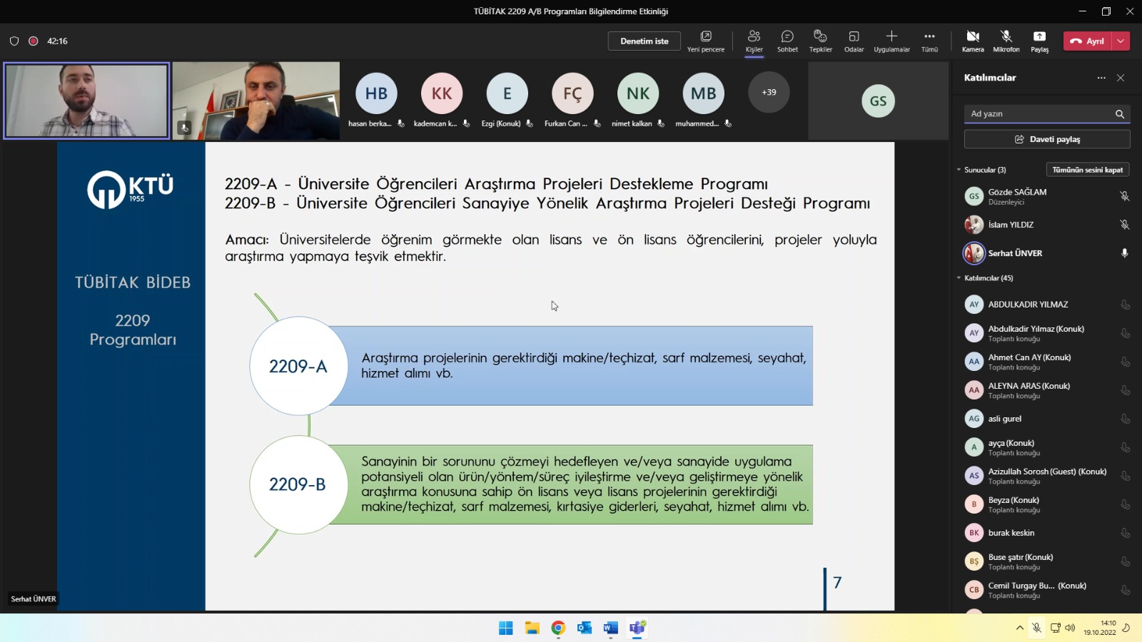 KTÜ Teknoloji Transferi Uygulama ve Araştırma Merkezi tarafından KTÜ lisans öğrencilerine yönelik “TÜBİTAK Lisans Öğrencileri Araştırma Projeleri Bilgilendirme Etkinliği” Proje Uzmanı M. Serhat ÜNVER tarafından 19.10.2022 tarihinde çevrim içi olarak gerçekleştirilmiştir. Etkinlikte lisans öğrencilerinin başvuru yapabileceği TÜBİTAK 2209 Programlarının başvuru koşullarının ve detaylarının yanı sıra, faydalanabilecekleri diğer programlarında detayları paylaşılmıştır.