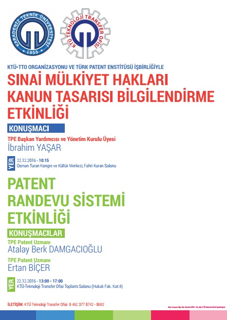 KTÜ-Teknoloji Transfer Ofisi (KTÜ-TTO) organizasyonuyla; 22 Aralık 2016 tarihinde Türk Patent Enstitüsü (TPE) uzmanları tarafından akademisyenlerimize yönelik olarak “Patent Randevu Sistemi” ve "Sınai Mülkiyet Hakları Kanun Tasarısı Bilgilendirme Etkinliği" gerçekleştirilecektir.