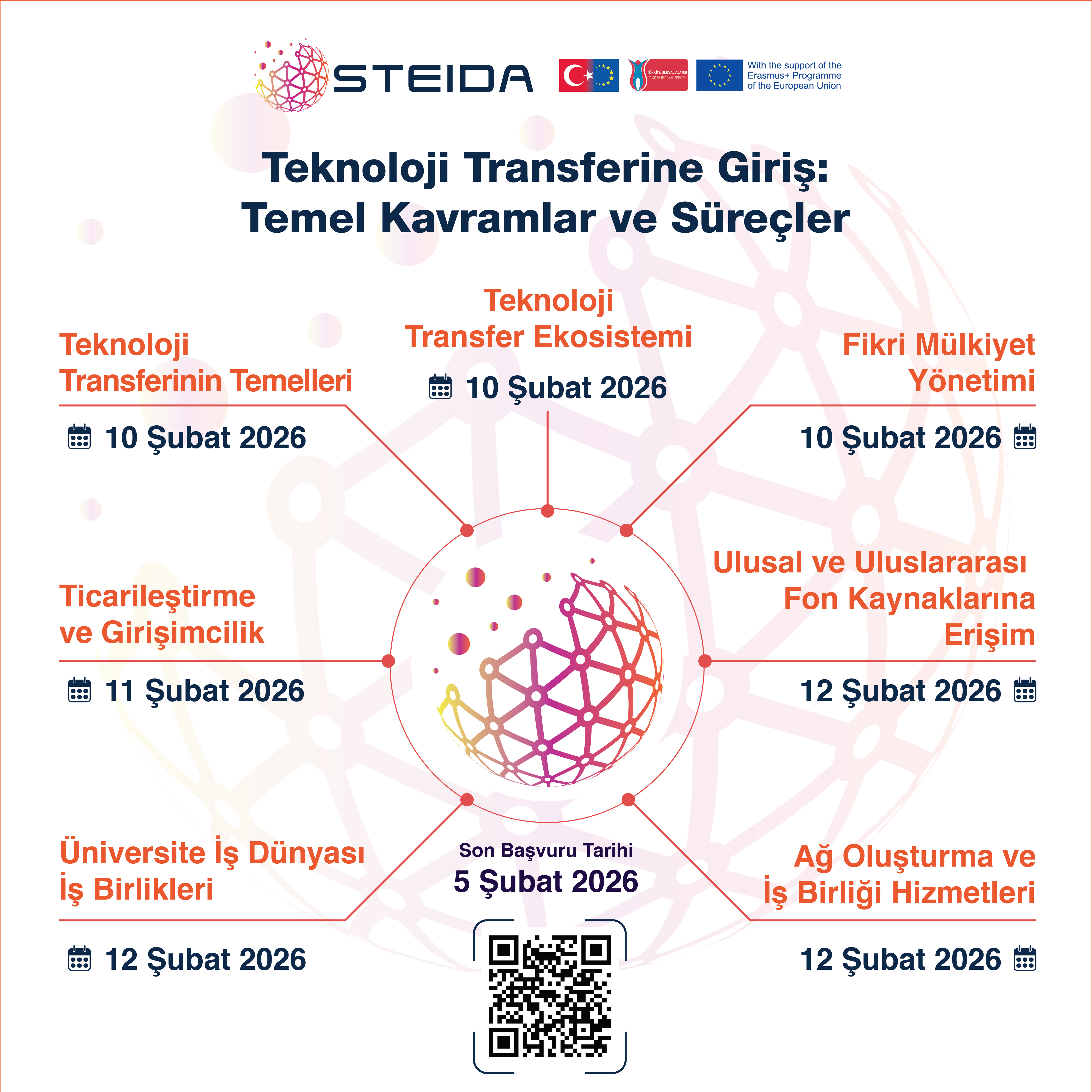 Karadeniz Teknik Üniversitesi Teknoloji Transferi Uygulama ve Araştırma Merkezi (KTÜ TTM)’nin yürütücüsü olduğu ve Erasmus+ Programı kapsamında desteklenen STEIDA - Yenilikçi ve Dijital Yaklaşımlarla Teknoloji Transferi Ekosisteminin Güçlendirilmesi Projesi kapsamında geliştirilen “Teknoloji Transferine Giriş: Temel Kavramlar ve Süreçleri” başlıklı eğitim programı çevrimiçi oturumlar aracılığıyla katılımcılarla buluşacaktır.