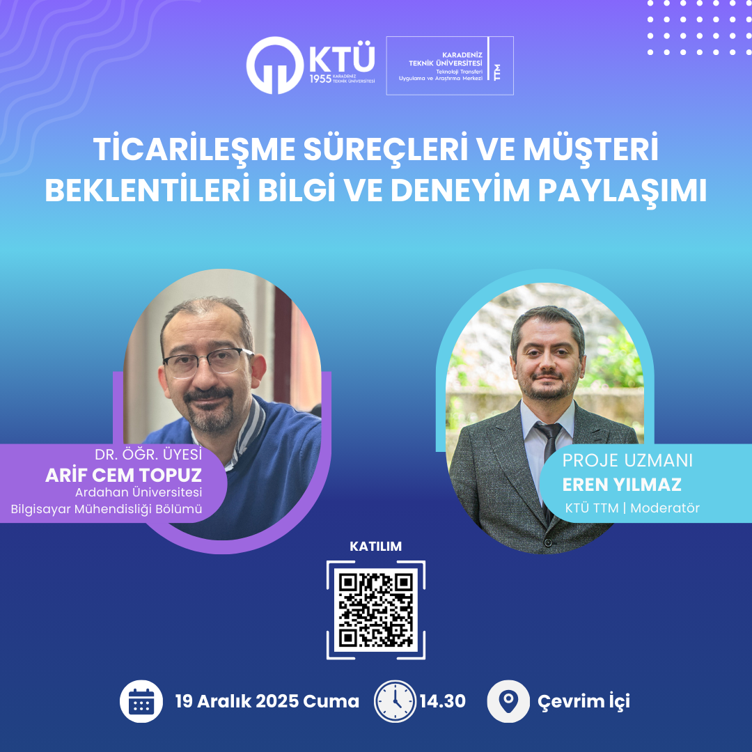 Bu etkinlikte, ticarileşme süreçleri ve müşteri beklentileri odağında; akademik bilginin ürüne dönüşmesi, pazara çıkış sürecinde karşılaşılan zorluklar, müşteri ihtiyaçlarının doğru analiz edilmesi ve teknoloji tabanlı çözümlerin gerçek kullanıcılarla buluşturulması gibi konular ele alınacaktır. Katılımcılar, bu süreçlerde dikkat edilmesi gereken kritik noktaları Dr. Öğr. Üyesi Arif Cem TOPUZ’un akademik ve uygulama temelli deneyimlerinden dinleme fırsatı bulacaktır.