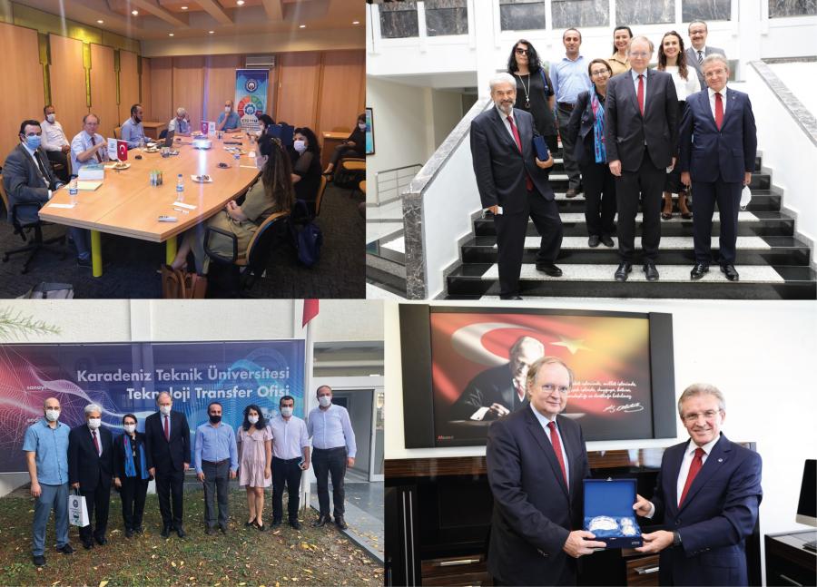 Rektör Yardımcımız Prof. Dr. Halil İbrahim OKUMUŞ tarafından heyete üniversitemiz hakkında genel bilgilendirme yapıldı. Görüşme sonrasında Büyükelçi Sayın BERGER ve Sayın OKUMUŞ tarafından günün anısına her iki tarafa hediye taktim edildi. Sonrasında üniversitemiz Teknoloji Transfer Merkezine geçen heyete AB projeleri başta olmak üzere üniversitemizde yürütülen projeler, üniversite sanayi işbirlikleri, fikri sınai mülkiyet hakları kapsamında yapılan çalışamalar konusunda KTÜ TTM Müdürü Doç. Dr. Oktay YILDIZ tarafından bilgilendirme yapıldı.