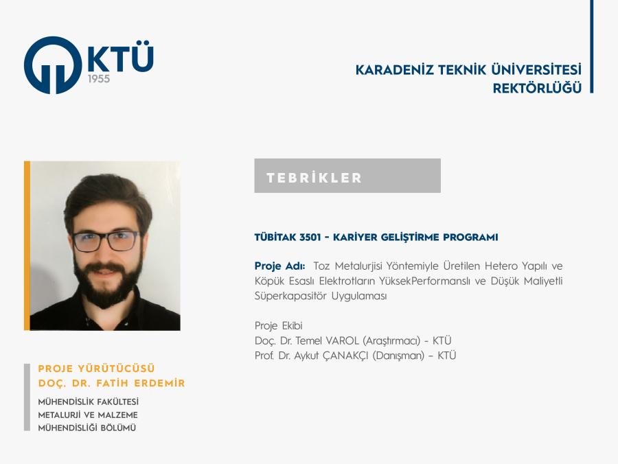 Üniversitemiz Mühendislik Fakültesi Metalurji ve Malzeme Mühendisliği Bölümü öğretim üyesi Doç. Dr. Fatih ERDEMİR’in "Toz Metalurjisi Yöntemiyle Üretilen Hetero Yapılı ve Köpük Esaslı Elektrotların Yüksek Performanslı ve Düşük Maliyetli Süperkapasitör Uygulaması" başlıklı projesi “TÜBİTAK 3501-Kariyer Geliştirme Programı” kapsamında desteklenmiştir.