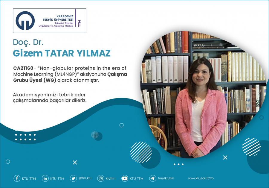 Üniversitemiz Tıp Fakültesi Temel Tıp Bölümü öğretim üyesi Doç. Dr. Gizem TATAR YILMAZ, COST Programı’nın “CA21160 - Non-globular proteins in the era of Machine Learning (ML4NGP) aksiyona Çalışma Grubu Üyesi (WG) olarak atanmıştır.