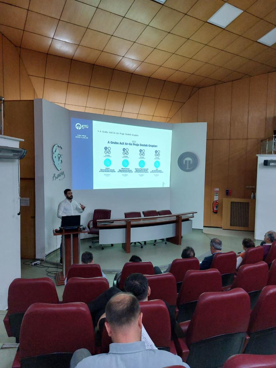 KTÜ Sağlık Bilimleri Enstitü Müdürü Prof. Dr. Ersan KALAY’ın açılış konuşması ile başlayan etkinlik KTÜ Teknoloji Transferi Uygulama ve Araştırma Merkezi’nde görevli Proje Uzmanı M. Serhat ÜNVER’in “Türkiye Sağlık Enstitüleri Başkanlığı (TÜSEB) Disiplinlerarası Proje Destekleri” başlıklı sunumu ile devam etti. Sunum kapsamında akademisyenlerin ve öğrencilerin başvuru yapabilecekleri TÜSEB Programları ve süreçler ile ilgili bilgilendirmenin ardından katılımcıların bilgi edinmek istedikleri konular hakkında sorular cevaplandırılmıştır.
