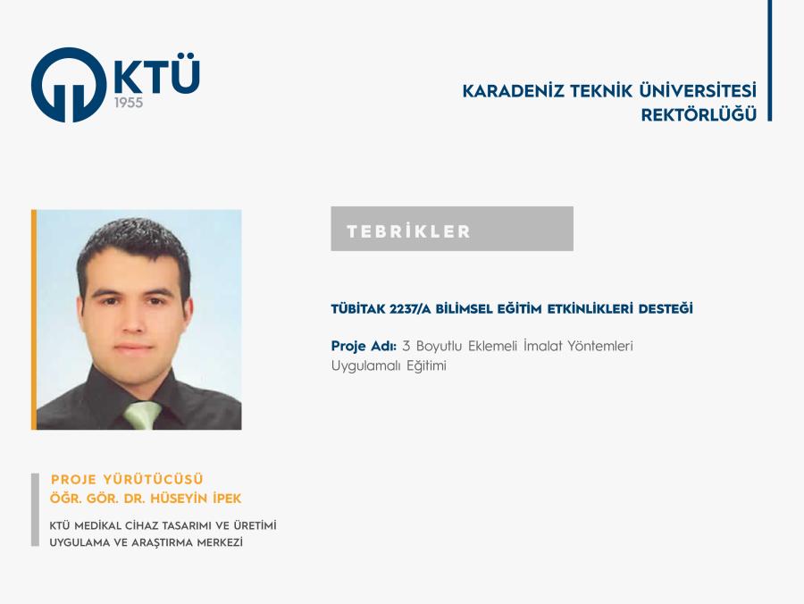 Üniversitemiz Medikal Cihaz Tasarımı ve Üretimi Uygulama ve Araştırma Merkezi öğretim elemanı Öğr. Gör. Dr. Hüseyin İPEK’in "3 Boyutlu Eklemeli İmalat Yöntemleri Uygulamalı Eğitimi" başlıklı projesi, “TÜBİTAK 2237/A Programı” kapsamında desteklenmiştir.