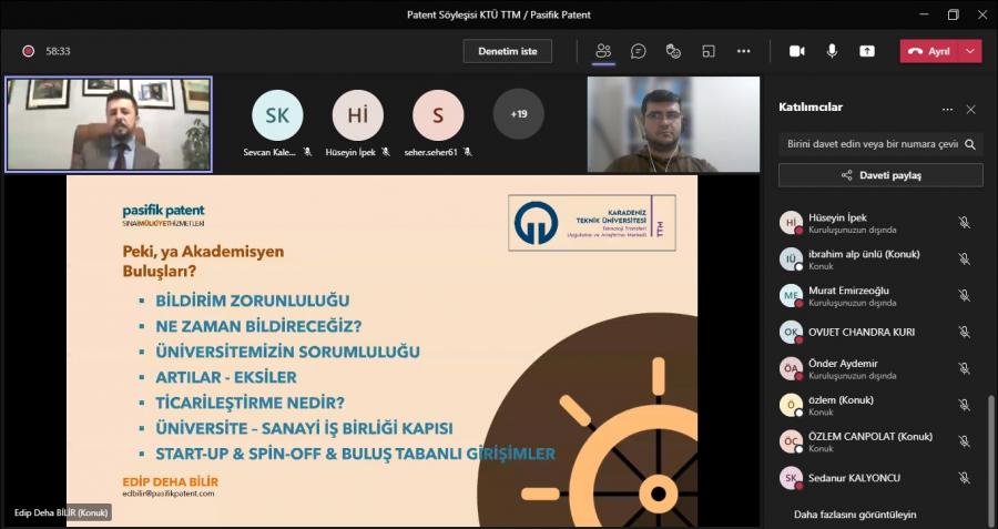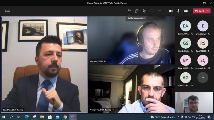 Pasifik Patent Kurucusu ve Patent Vekili Edip Deha BİLİR ve KTÜ TTM iş ortaklığı kapsamında Sağlık ve Mühendislik/Teknik alanlarında patent ekosistemine sağlayacağı katkının arttırılması, tescil süreçlerine hızlı şekilde ilerleyen patent başvurularının elde edilmesi ve ticarileşme potansiyeli odağında akademik çalışmalarını patente konu edebilen buluş sahiplerinin ekosisteme kazandırılması amacıyla 23-24 Eylül Tarihlerinde söyleşi düzenlenmiştir.