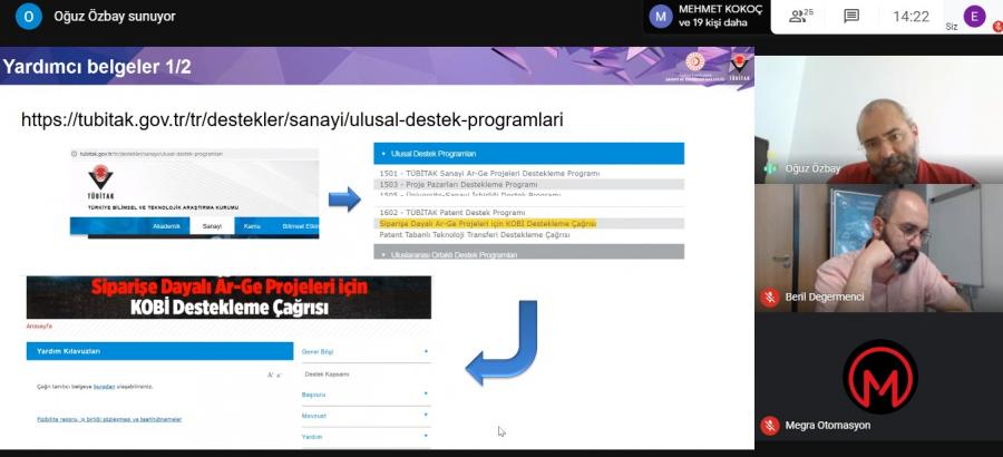 Siparişe Dayalı Ar-Ge Projeleri için KOBİ Destekleme ve Patent Tabanlı Teknoloji Transferi Destekleme Çağrısı hakkında KTÜ TTM ev sahipliğinde TÜBİTAK Bilimsel Programlar Başuzmanı Oğuz ÖZBAY VE TÜBİTAK TEMEG Koordinatöre Alp Eren YURTSEVEN tarafından çevrimiçi eğitim düzenlendi. Bölgedeki paydaş üniversitelerin ve ulusal firmaların katılımıyla etkinlik gerçekleştirildi.