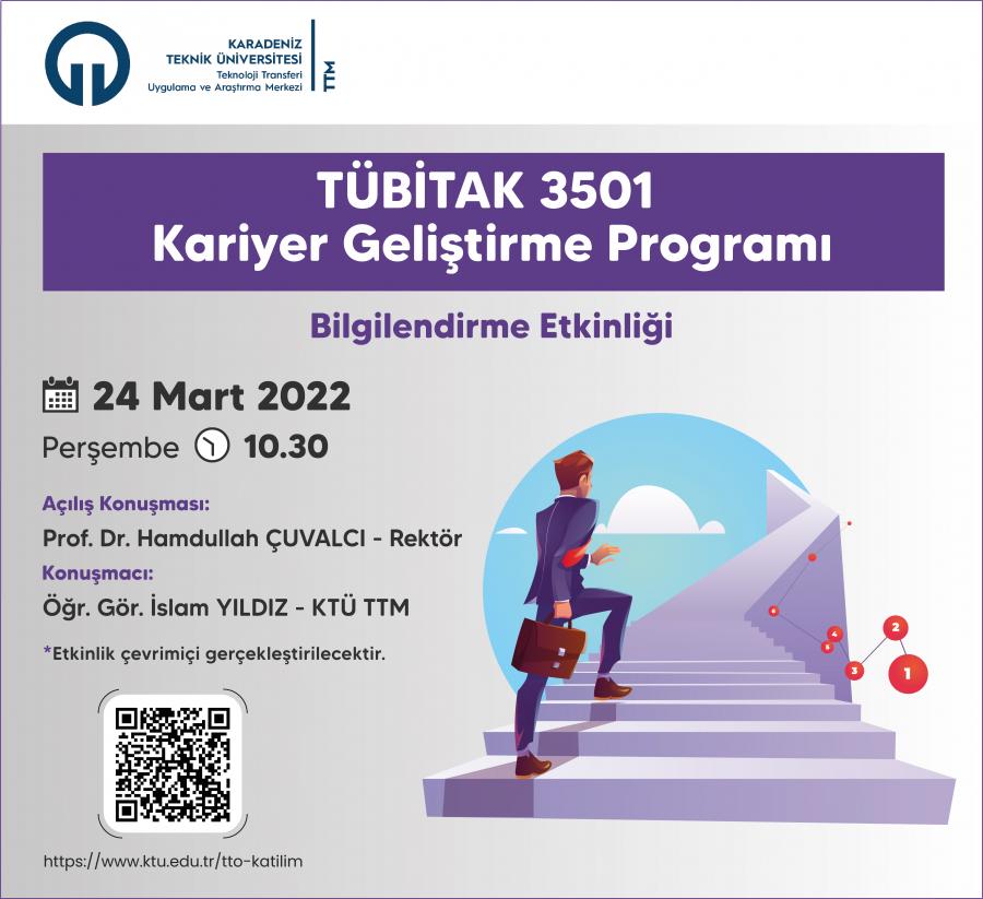 Üniversitemiz akademisyenlerine yönelik TÜBİTAK 3501 - Kariyer Geliştirme Programı tanıtımı ve yapılan değişiklerle ilgili Karadeniz Teknik Üniversitesi Teknoloji Transferi Uygulama ve Araştıma Merkezi tarafından 24 Mart 2022 Perşembe saat 10:30’da çevrimiçi bilgilendirme etkinliği düzenlenecektir.