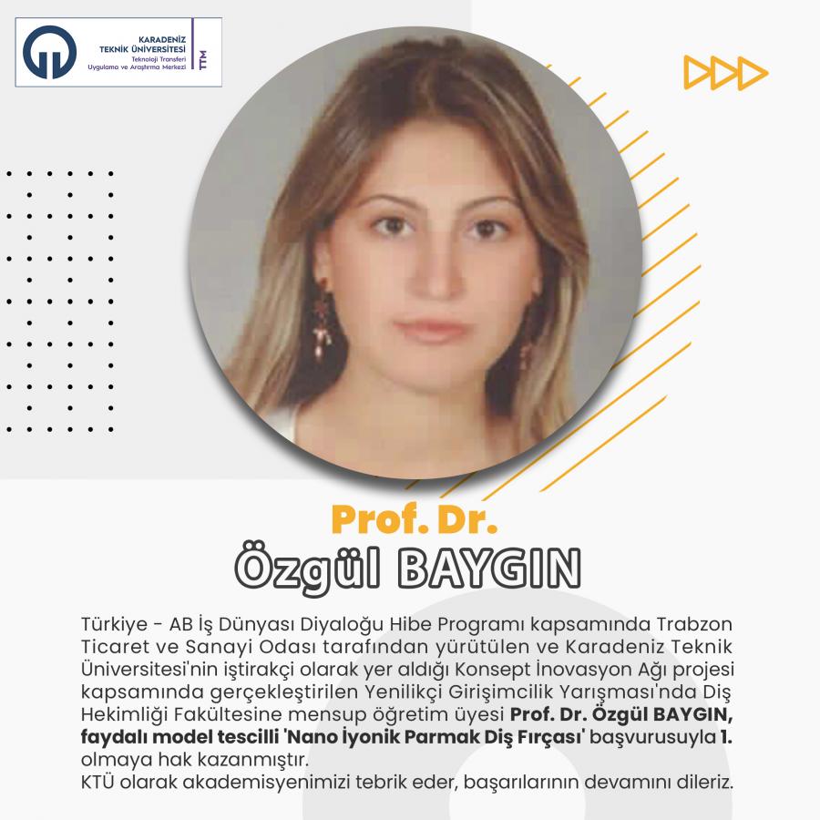 Türkiye - AB İş Dünyası Diyaloğu Hibe Programı kapsamında Trabzon Ticaret ve Sanayi Odası tarafından yürütülen ve Karadeniz Teknik Üniversitesi'nin iştirakçi olarak yer aldığı Konsept İnovasyon Ağı projesi kapsamında gerçekleştirilen Yenilikçi Girişimcilik Yarışması'nda Diş Hekimliği Fakültesine mensup öğretim üyesi Prof. Dr. Özgül BAYGIN, faydalı model tescilli 'Nano İyonik Parmak Diş Fırçası' başvurusuyla 1. olmaya hak kazanmıştır.