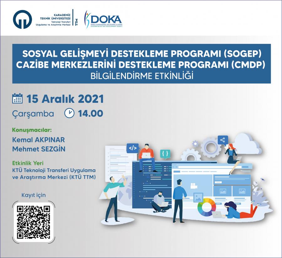 Üniversitemiz akademisyenlerine yönelik; Doğu Karadeniz Kalkınma Ajansı (DOKA) işbirliğiyle T.C. Sanayi ve Teknoloji Bakanlığı’nın tematik bölgesel kalkınma programları arasında yer alan ‘Cazibe Merkezlerini Destekleme Programı (CMDP)’ ve ‘Sosyal Gelişmeyi Destekleme Programı (SOGEP)’ hakkında 15.12.2021 Çarşamba Günü, Saat 14:00’te bilgilendirme etkinliği düzenlenecektir.