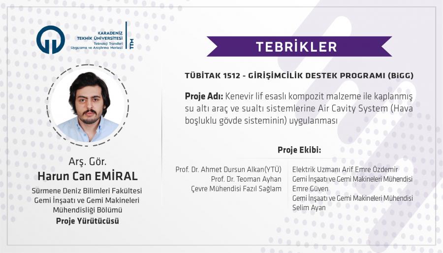 Üniversitemiz Sürmene Deniz Bilimleri Fakültesi Gemi İnşaatı ve Gemi Makineleri Mühendisliği Bölümü'nden Arş. Gör. Haruncan Emiral'in, TÜBİTAK 1512 - Girişimcilik Destek Programı kapsamında "Kenevir lif esaslı kompozit malzeme ile kaplanmış su altı araç ve sualtı sistemlerine Air Cavity System (Hava boşluklu gövde sisteminin) uygulanması” başlıklı projesi desteklenmiştir.