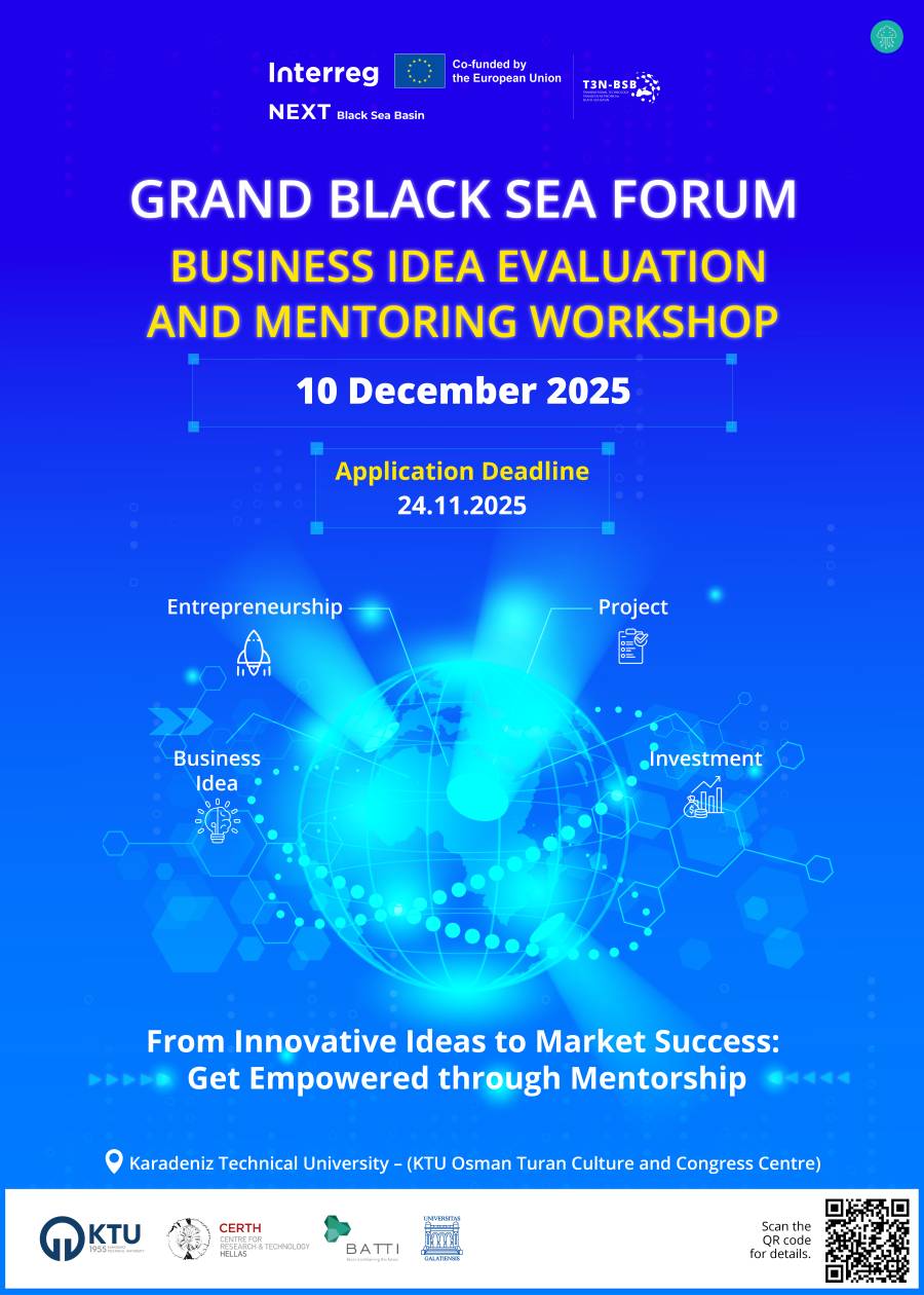 Hosted by Karadeniz Technical University, the Grand Black Sea Forum (T3N-BSB Project) will be held in Trabzon from 10 to 12 December 2025. Participants are invited to attend events aimed at strengthening the regional innovation and entrepreneurship ecosystem.