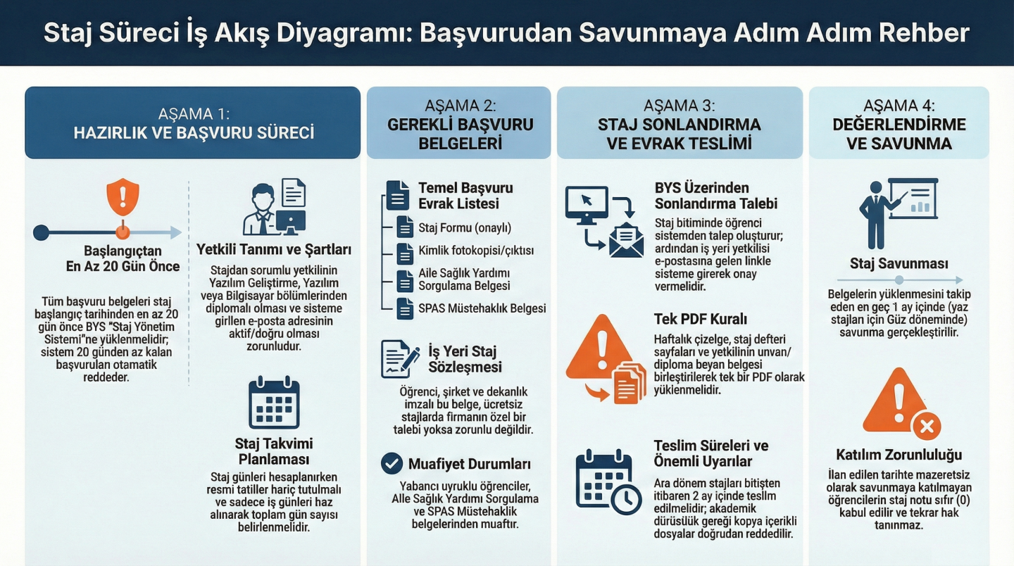 Öğrencilerin, staj başlangıç tarihinden en az 20 (yirmi) gün önce gerekli belgeleri sisteme yüklemiş olması gerekmektedir. Bu sürenin altında kalan başvurular sistem tarafından otomatik olarak reddedileceğinden, tarih planlaması tamamen öğrencinin sorumluluğundadır.